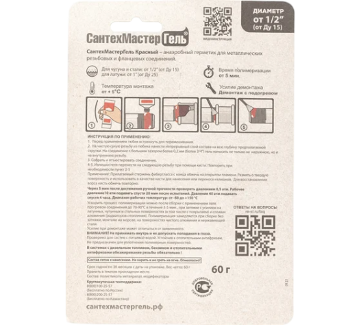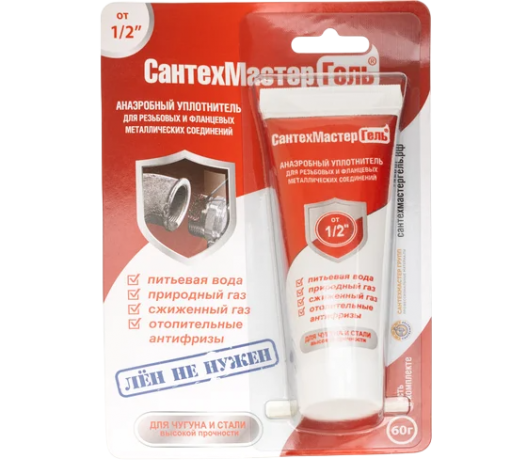 Гель СантехМастер — это анаэробный герметик для резьбовых соединений из черного металла. Этот гель отлично подходит для сверхпрочной фиксации и герметизации резьбы и фитингов в трубопроводах, собранных с использованием черных металлов. Применяется для соединений диаметром от 1,5".