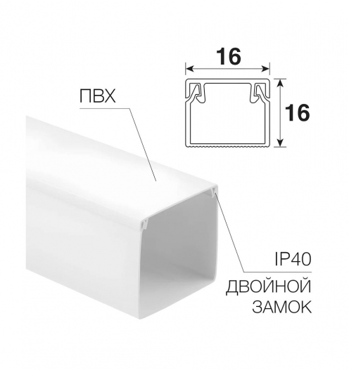 Кабель-канал размером 16х16 мм белого цвета предназначен для прокладки слаботочных и силовых электрических коммуникаций открытого типа, эксплуатируемых при напряжении переменного тока величиной до 1000 В. Также используется для прокладки компьютерных, телевизионных, телефонных и IT-сетей.