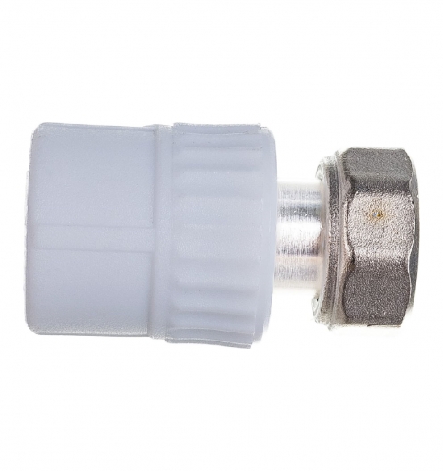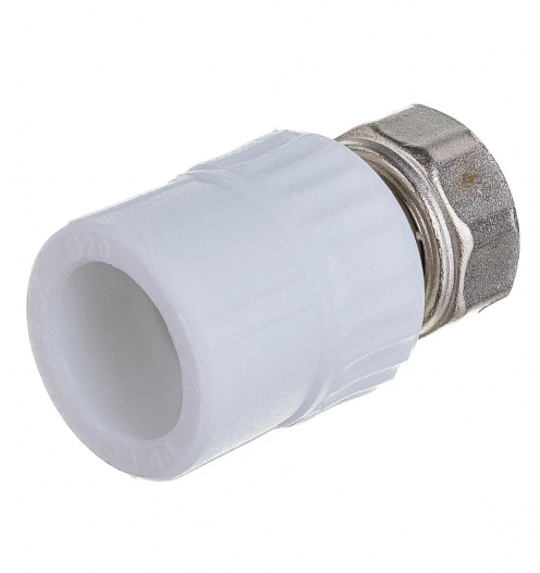 Комбинированный полипропиленовый фитинг. Представляет собой разъемное соединение между пластиковой и металлической трубами. Латунные части производятся методом горячего штампования, пластиковые - методом литья под давлением.