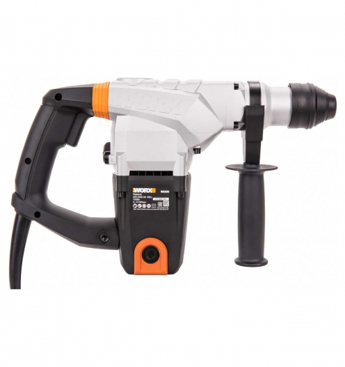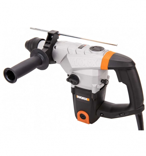 Трехрежимный перфоратор WORX WX333 – относится к инструментам тяжелого класса. Прибор оснащен вертикальным щеточным двигателем, кабелем для подключения к сети 220 В и стандартным креплением для буров SDS-Plus. С его помощью вы легко просверлите аккуратные отверстия в металле с диаметром до 1.3 см, бетоне до 3.2 см и древесине до 4 см.