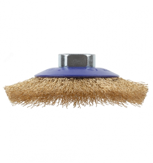 Щетка типа "Тарелка" с посадочным размером M14 идеально подходит для углов, пазов и изгибов. Латунированная проволока диаметром 0,3 мм обеспечивает щадящую зачистку, не повреждая поверхность.
