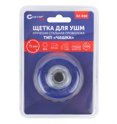 Щетка для УШМ, тип ''Чашка'', М14, отлично подходит для обработки больших плоскостей. Форма ''Чашка'' обеспечивает хорошую площадь прилегания к поверхности. Конструкция щетки оснащена усиленной гайкой с шайбой (кроме D65), которая способствует предотвращению деформации изделия. Идеальная балансировка щеток значительно продлевает срок службы инструмента. Металлическая проволока 0,5 мм. Упаковка – блистер. Упаковка – блистер.